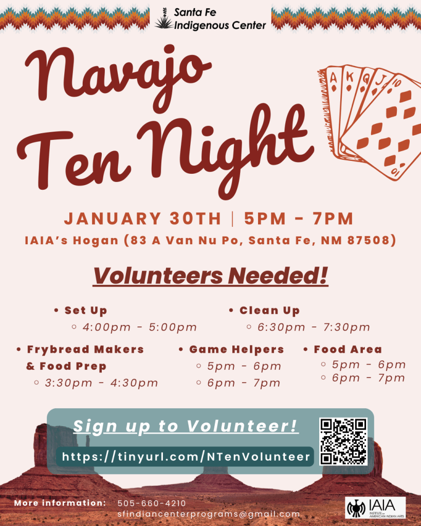 Join us for an evening of learning and playing Navajo Ten. This is a social event with no gambling involved. We will be serving Navajo Tacos! For any questions, please contact Danielle at 505.660.4210 or sfindiancenterprograms@gmail.com