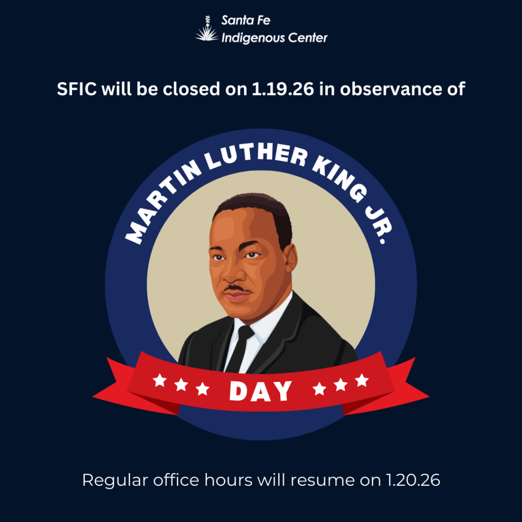 The Santa Fe Indigenous Center will be closed on January 19th, 2026, in observance of Martin Luther King Jr. Day. Our regular office hours will resume on January 20th, 2026, at 10am.