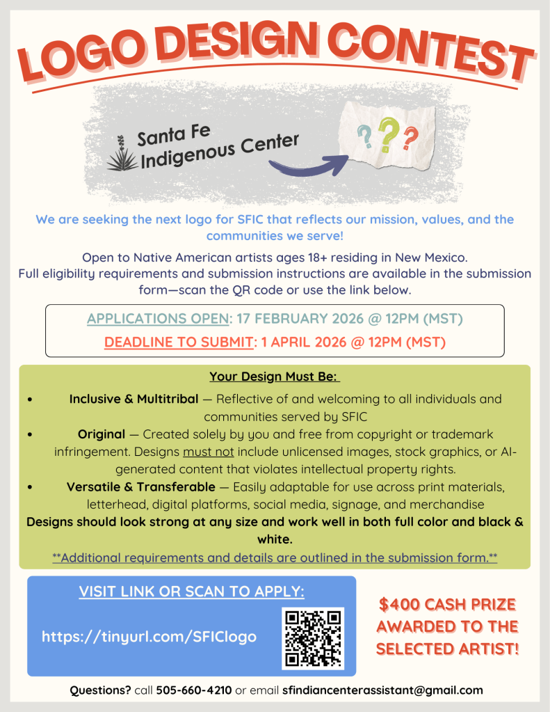 The Santa Fe Indigenous Center (SFIC) is hosting a Logo Design Contest, and we’re looking for the next logo design that reflects our mission, values, and the diverse communities we serve.