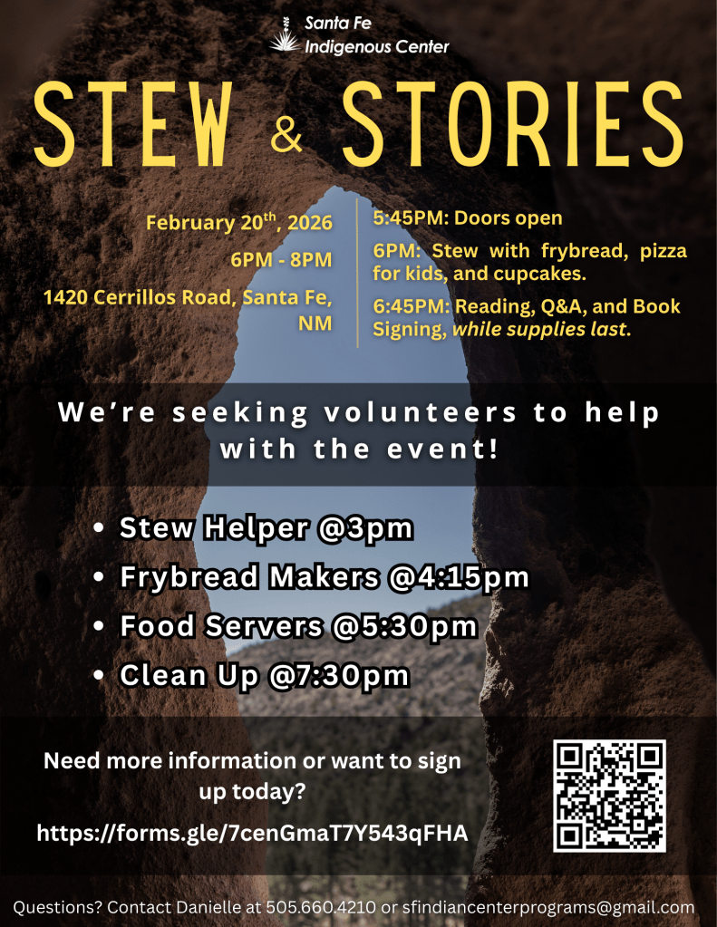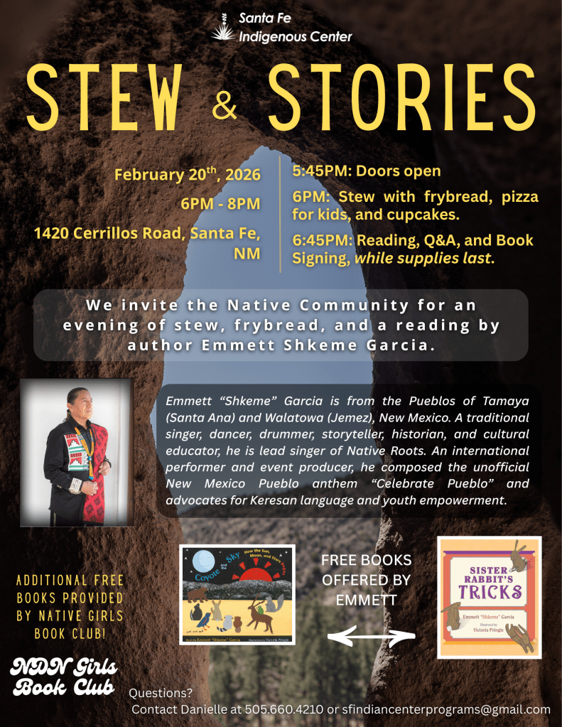 The Santa Fe Indigenous Center invites the Native Community for an evening of stew, frybread, and a reading by author Emmett “Shkeme” Garcia. No RSVP required!