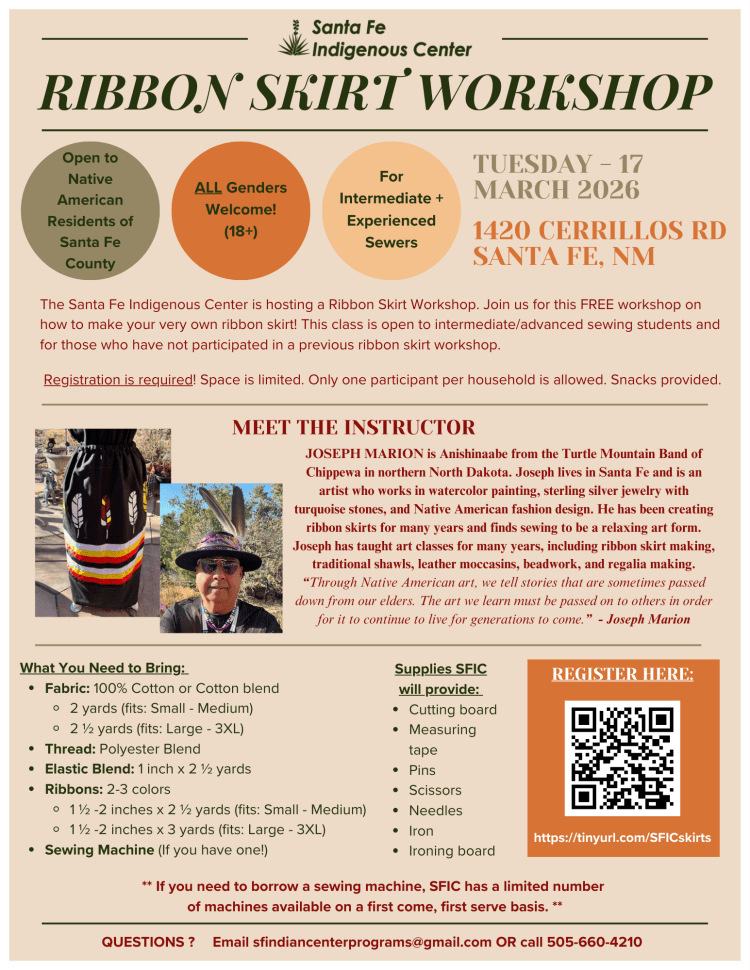We appreciate your interest in joining our Ribbon Skirt Workshop at the Santa Fe Indigenous Center! At this time, the class is fully booked, and we are no longer accepting registration forms.