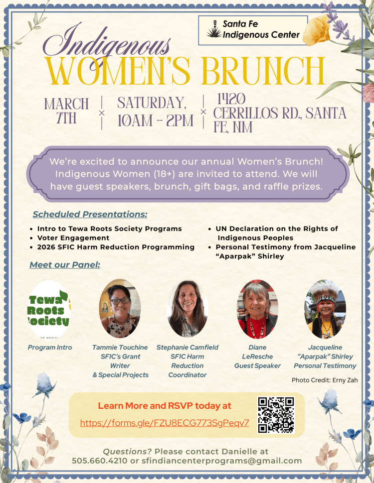 Thank you to all the Indigenous women (18+) who signed up to attend. This year’s gathering will include brunch, guest speakers, gift bags, and raffle prizes, along with discussions on the UN Declaration on the Rights of Indigenous Peoples, a personal testimony from Jacqueline “Aparpak” Shirley, an introduction to Tewa Roots Society programs, voter engagement, and 2026 SFIC Harm Reduction programming.