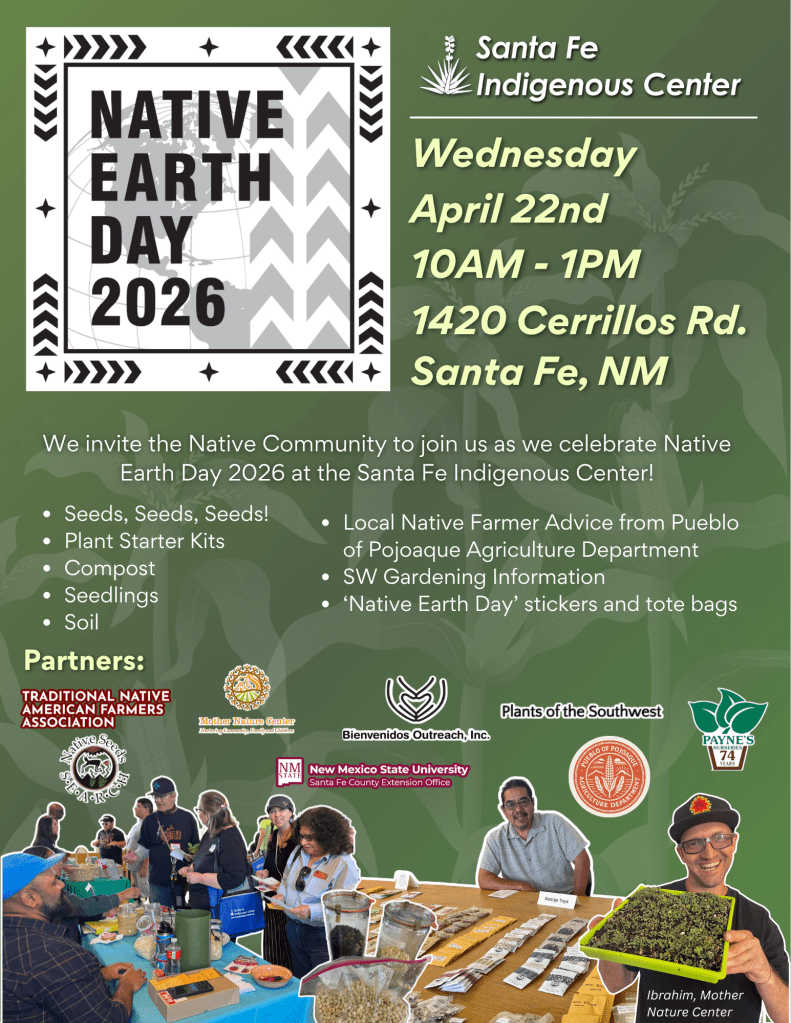 We invite the Native Community to join us as we celebrate Native Earth Day 2026 at the Santa Fe Indigenous Center! Pick up seeds and plant starter kits from SFIC and visit some of our partners including Mother Nature Center, Bienvenidos Outreach, NMSU Santa Fe County Extension Office, and Pueblo of Pojoaque Agriculture Department and more!